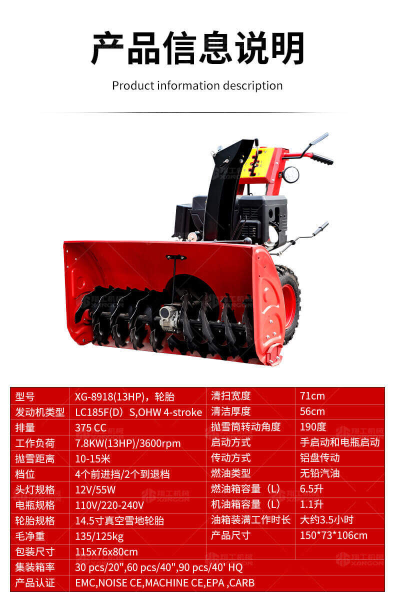 XG-8918(13HP)手推式拋雪機是一款地面拋雪機,路面拋雪機,道路拋雪機。這款拋雪機采用LC185F(D)S,OHW 4-stroke發(fā)動機,強勁有力。葉片高速旋轉將雪旋進掃雪車里,再通過導管運到儲雪箱中。其特點是:采用大功率主機,寬幅、卓效,使用較廣。