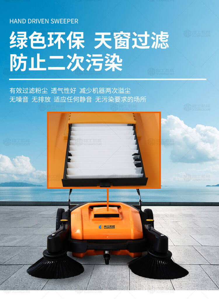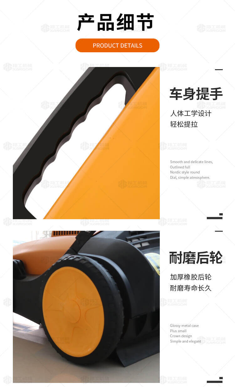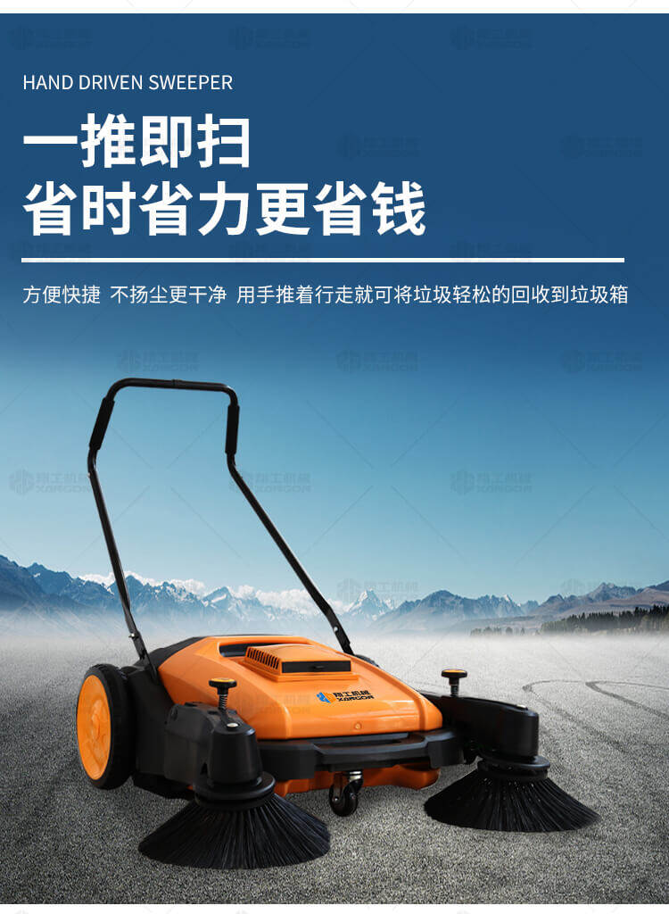 手推式掃地機能清潔房屋周邊范圍:包括小路,公路,車道和院子,能比用普通的掃把和簸箕節(jié)省5倍的時間,清掃時垃圾被迅速的收集到塵箱,簡單、快速、干凈。