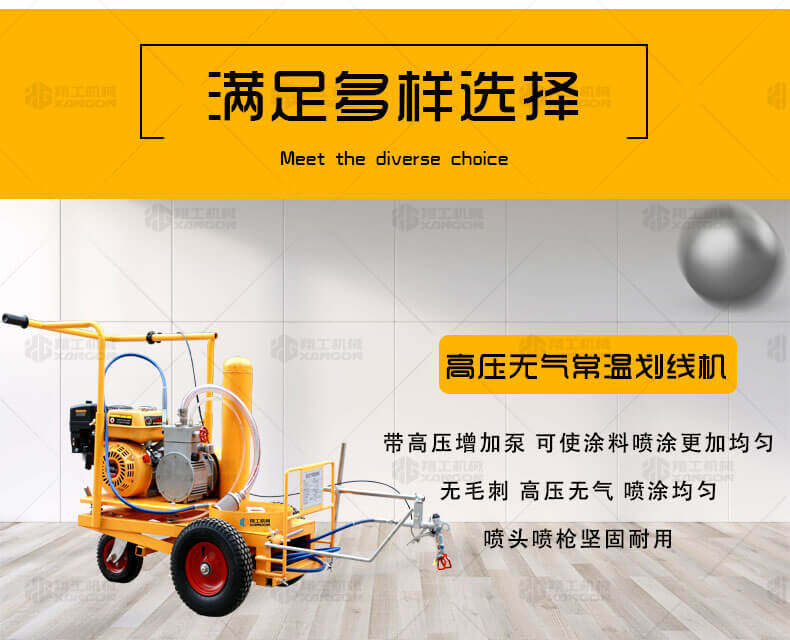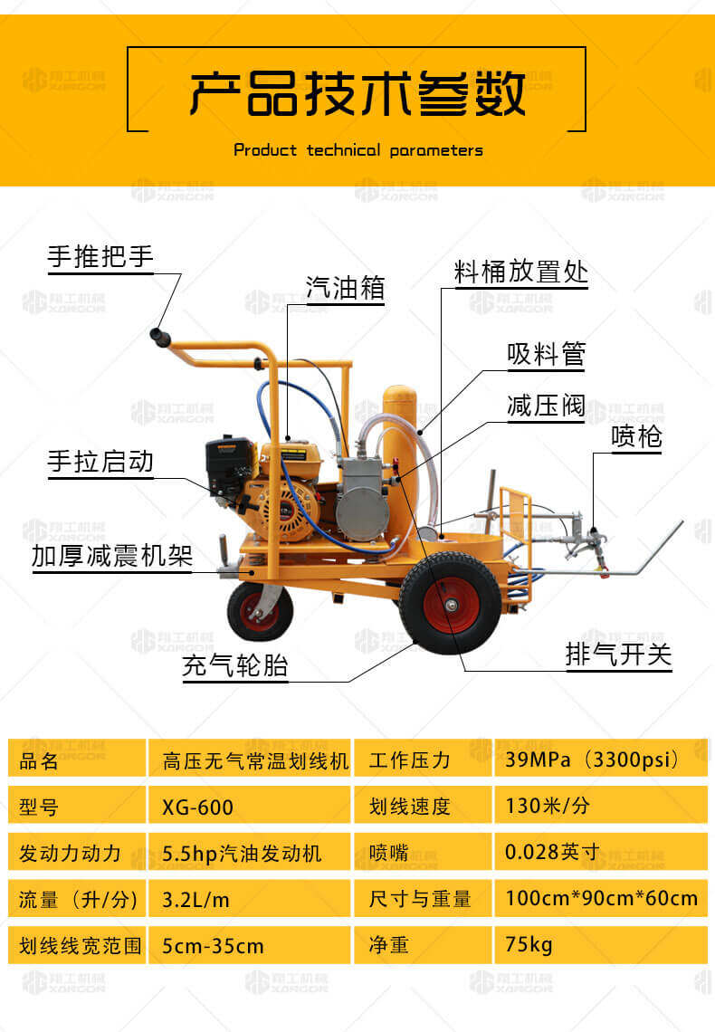 高壓無氣常溫劃線機利用汽油機驅(qū)動單注塞泵,使涂料在機內(nèi)形成高壓進行噴涂,索劃線厚薄均勻邊角齊,噴槍架導(dǎo)向桿升降設(shè)計,調(diào)節(jié)噴涂寬度更為準確方便。該機器是常溫標線施工的專用設(shè)備,主要用于公路、停車場、機場、加油站、公司廠區(qū)等涂畫直線、虛線、曲線、斑馬線、文字、箭頭、圖形、標志等。