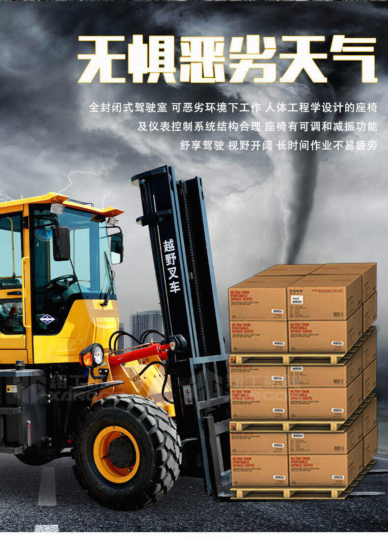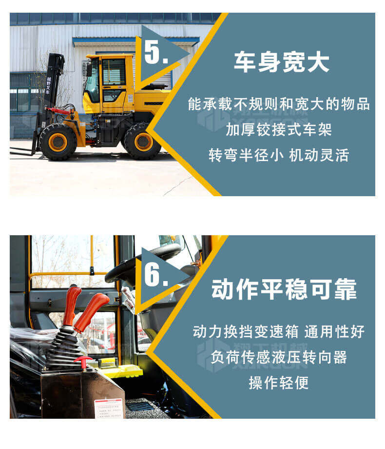 5.越野叉車發(fā)動機(jī)功率大,采用全輪驅(qū)動和越野輪胎。