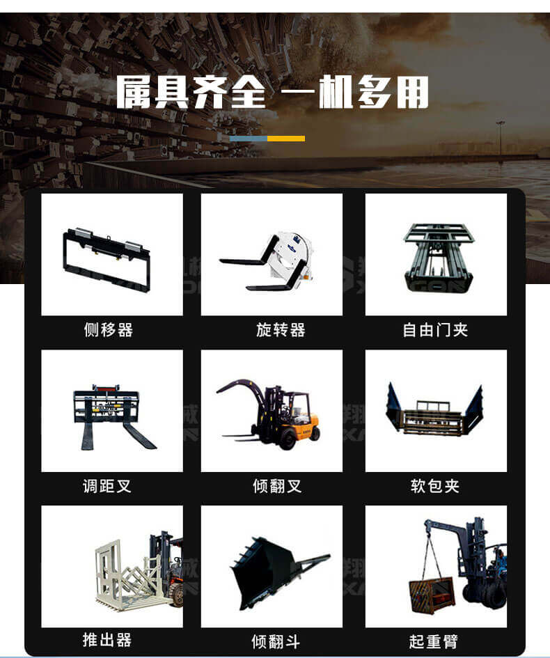 多功能四驅(qū)越野叉車可以在坡地和不平地面上進(jìn)行貨物裝、卸、堆垛及搬運(yùn)作業(yè),具有良好的機(jī)動性、越野性可靠性。其功能多樣,可搭配側(cè)移器、調(diào)距叉、旋轉(zhuǎn)器、軟包夾、推出器、側(cè)翻叉、側(cè)翻斗、起重臂等工具完成不同的工作。