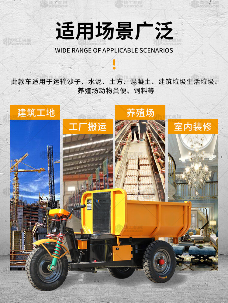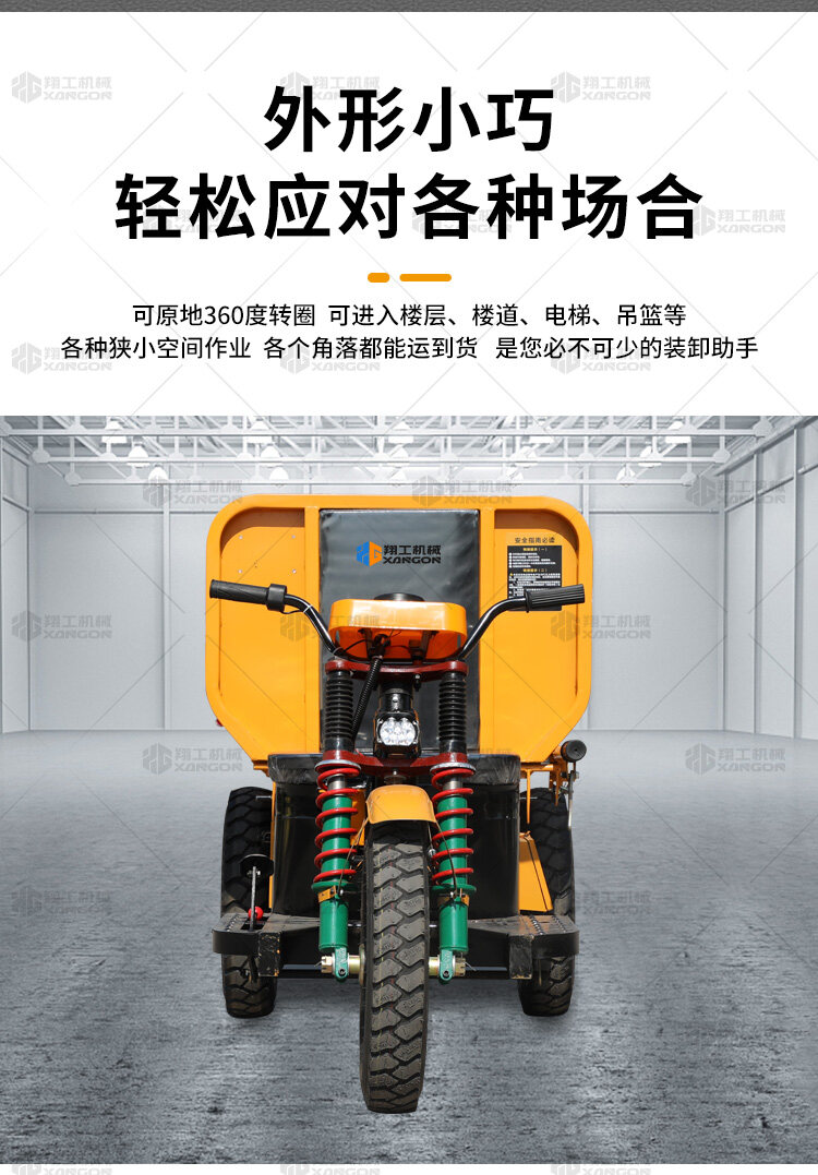 此款車適用于建筑工地、室內(nèi)裝修、養(yǎng)殖場、工廠等場所,運(yùn)輸沙子、水泥、土方、混凝土、建筑垃圾生活垃圾、養(yǎng)殖場動物糞便、飼料等,體積小操作簡單靈活,可原地360度轉(zhuǎn)圈,可進(jìn)入樓層、樓道、電梯、吊籃等各種狹小空間作業(yè),是您必不可少的裝卸助手。