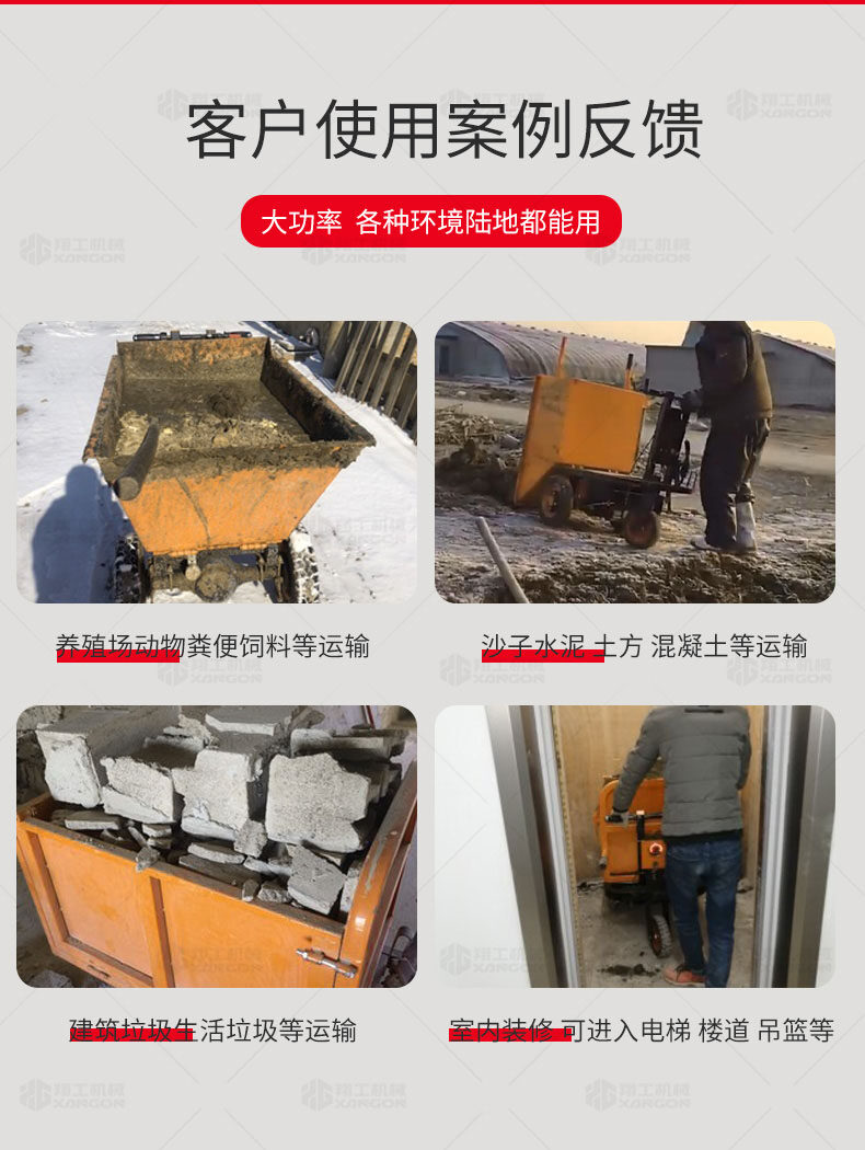此款車適用于建筑工地、室內(nèi)裝修、養(yǎng)殖場(chǎng)、工廠等場(chǎng)所,運(yùn)輸沙子、水泥、土方、混凝土、建筑垃圾生活垃圾、養(yǎng)殖場(chǎng)動(dòng)物糞便、飼料等,體積小操作簡(jiǎn)單靈活,可原地360度轉(zhuǎn)圈,可進(jìn)入樓層、樓道、電梯、吊籃等各種狹小空間作業(yè),是您必不可少的裝卸助手。