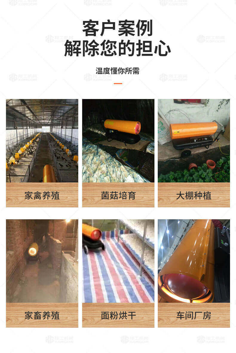 廠房、車間、養(yǎng)殖、建筑工地、辦公室、宿舍等局部取暖設(shè)施。 ☆任何需要加溫的場所。