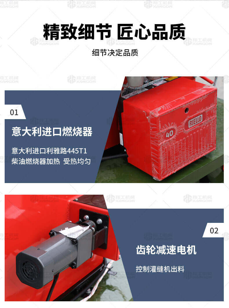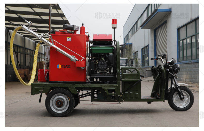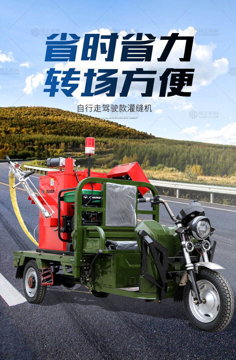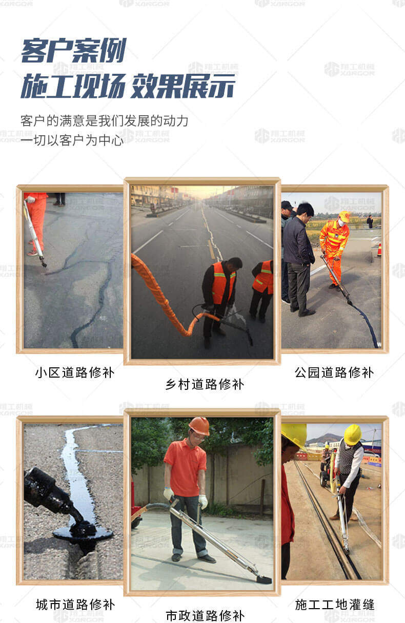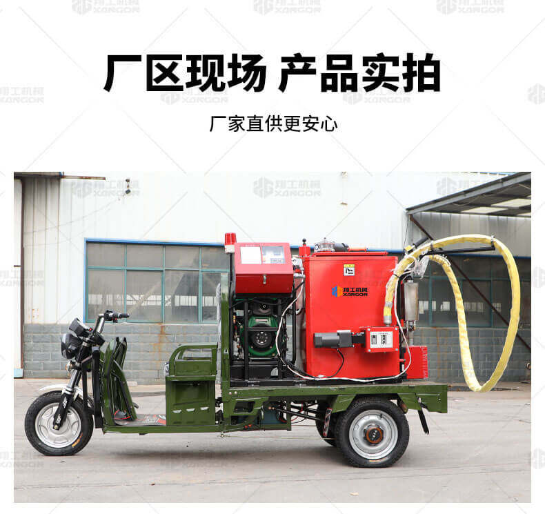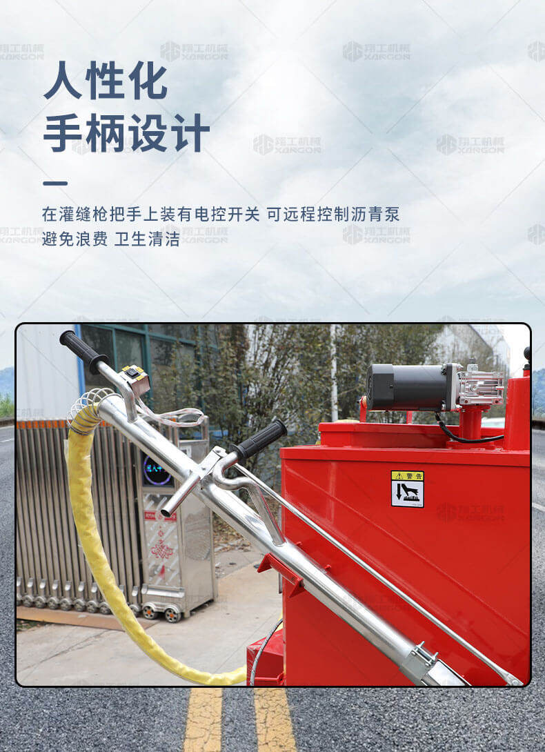 主要用于瀝青或水泥路面裂縫瀝青灌縫。汽油灌縫機(jī)主要有手推式和自行式手持灌縫管操作,采用進(jìn)口柴油燃燒器加熱。在工作時(shí)首先在料箱內(nèi)加入瀝青或灌縫膠,啟動(dòng)發(fā)電機(jī)供電,依次間斷打開導(dǎo)熱油泵開關(guān),燃燒器開關(guān),出料管加熱開關(guān);調(diào)整自動(dòng)溫控系統(tǒng)與材料的溫度相同,通過柴油燃燒器自動(dòng)加熱熔料箱內(nèi)導(dǎo)熱油開始升溫(拖式為強(qiáng)制循環(huán))使材料融化,溫度是通過自控系統(tǒng)來控制。溶料時(shí)間大約30-40分鐘左右。在材料融化、出料管溫度達(dá)到后可以進(jìn)行工作。手持灌縫管對(duì)正裂縫灌縫處理。瀝青泵的出料流量可調(diào)。在工作過程中隨時(shí)添加材料保證工作的連續(xù)性。