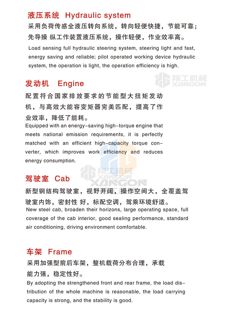 主要用于鏟裝土壤、砂石、石灰、煤炭等散狀物料,也可對礦石、硬土等作輕度鏟挖作業(yè)。換裝不同的輔助工作裝置還可進(jìn)行推土、起重和其他物料如木材的裝卸作業(yè)。在道路、特別是在高等級公路施工中,裝載機用于路基工程的填挖、瀝青混合料和水泥混凝土料場的集料與裝料等作業(yè)。