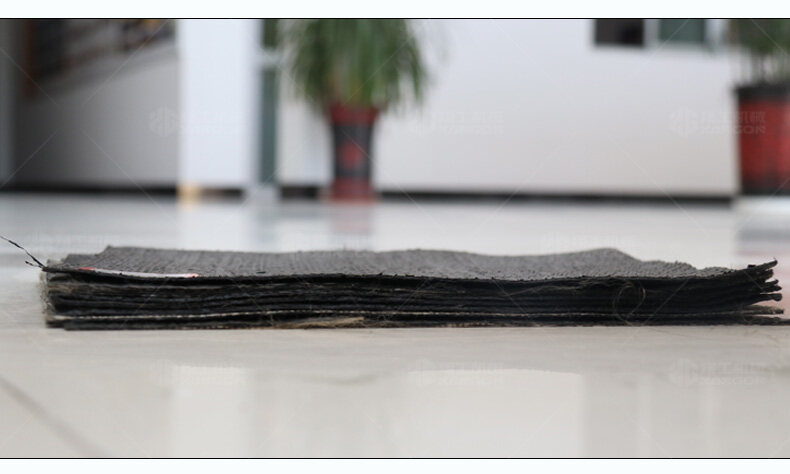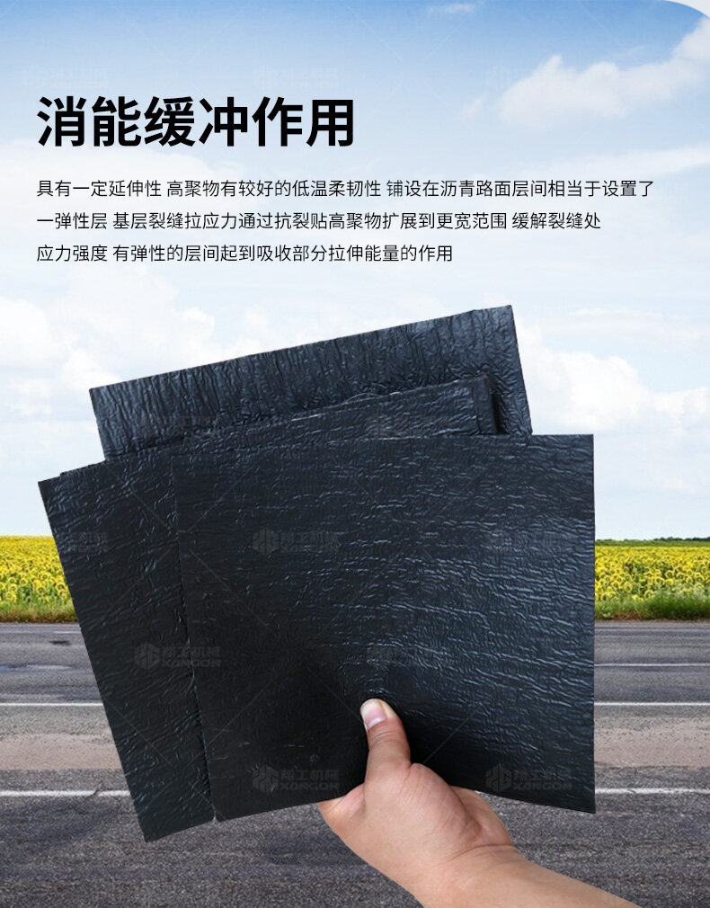 防裂貼(又稱抗裂貼)是由瀝青基的高分子聚合物、抗拉胎基、耐高溫并與瀝青相容的織物復(fù)合而成。將其貼于產(chǎn)生裂縫或剝落的瀝青混泥土面,能減少并阻隔其作用于路面的溫縮應(yīng)力,因此也減少了裂縫反射穿過面層的趨勢,鋪設(shè)與路面因其將基層與上部磨耗層隔離開來,從而使上面層免受多向位移及剪切應(yīng)力的影響,用于公路、橋梁、機(jī)場等。