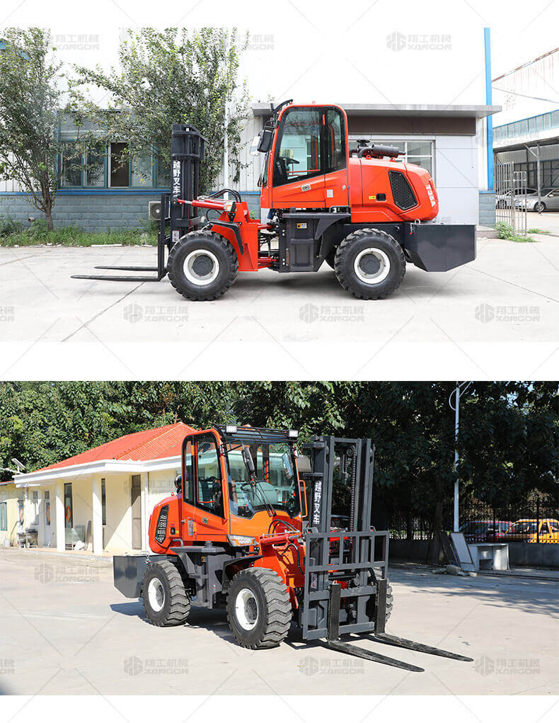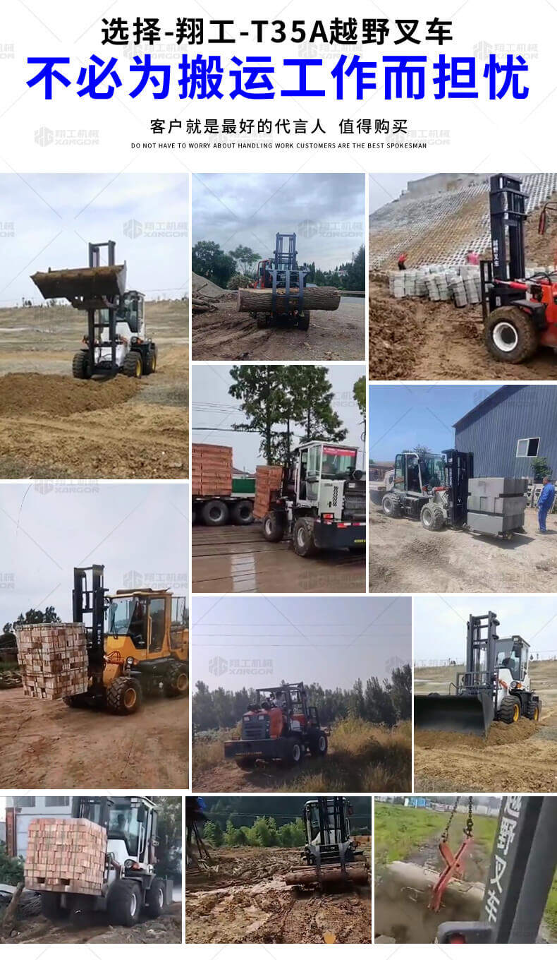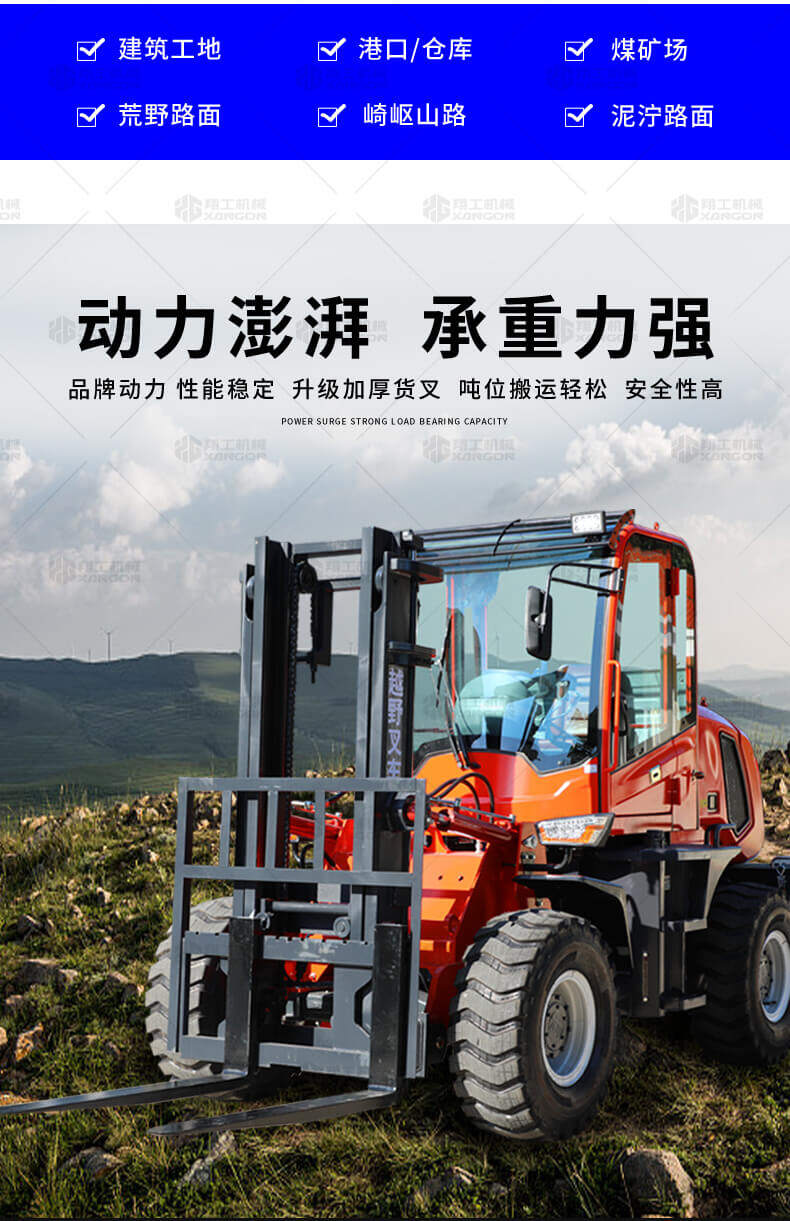 越野叉車可以在坡地和不平地面上進(jìn)行貨物裝、卸、堆垛及搬運(yùn)作業(yè),具有良好的機(jī)動(dòng)性、越野性可靠性。其功能多樣,可搭配側(cè)移器、調(diào)距叉、旋轉(zhuǎn)器、軟包夾、推出器、側(cè)翻叉、側(cè)翻斗、起重臂等工具完成不同的工作。