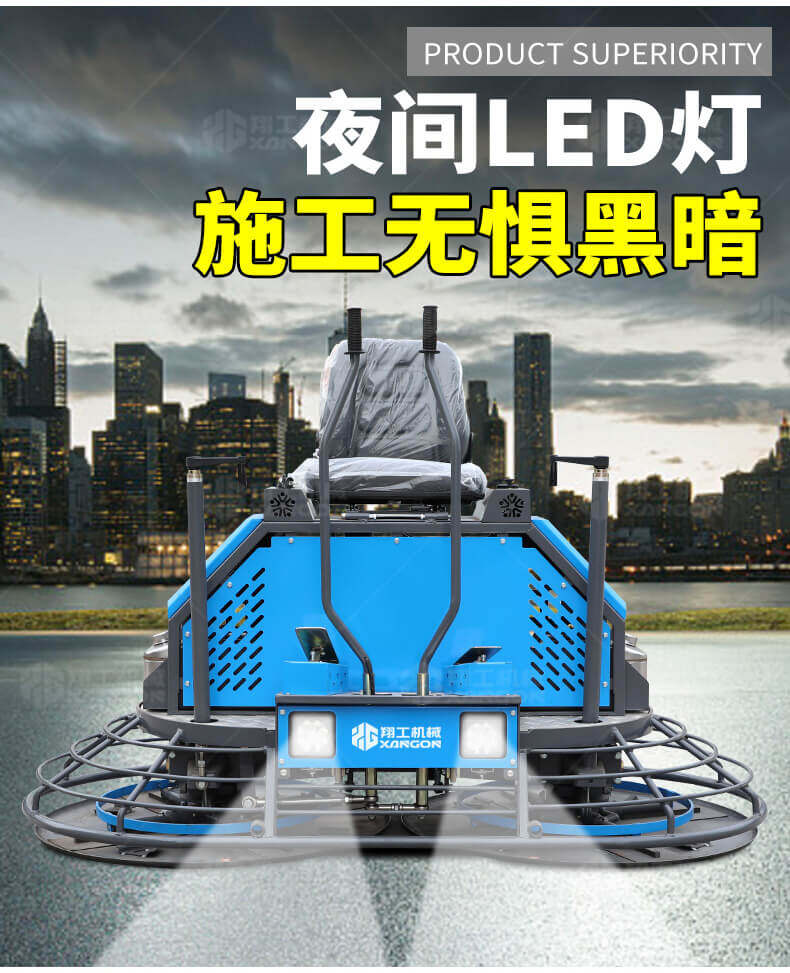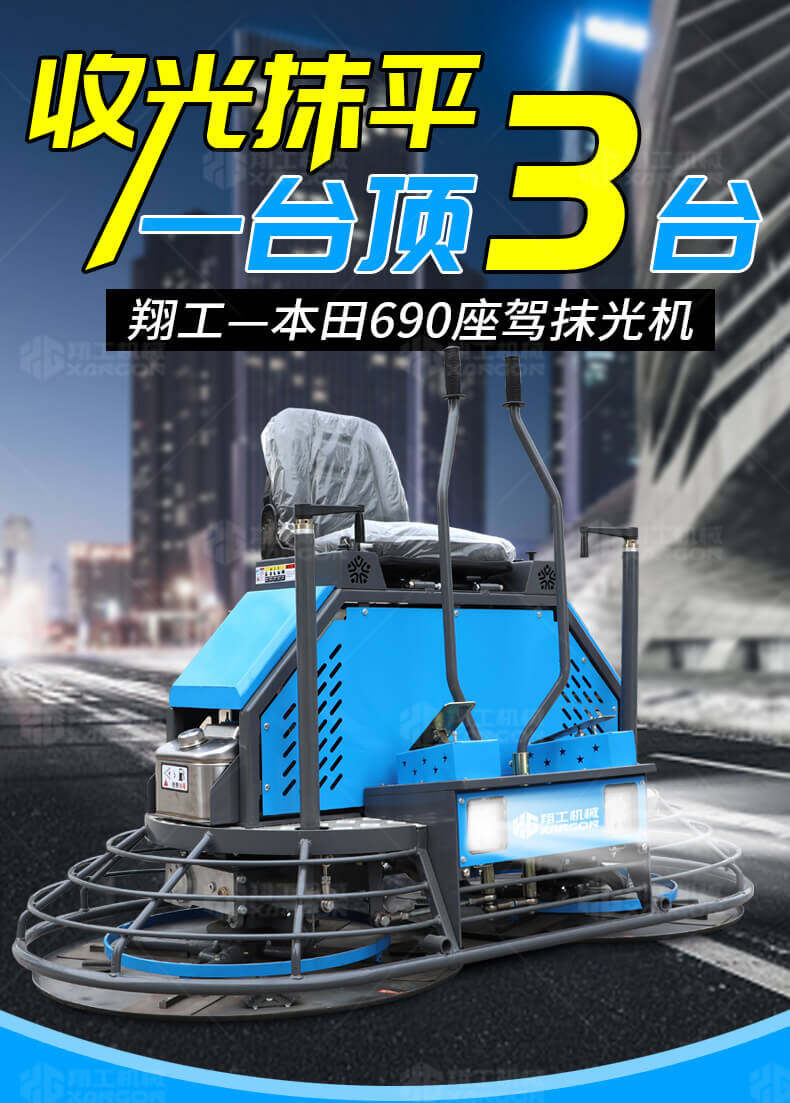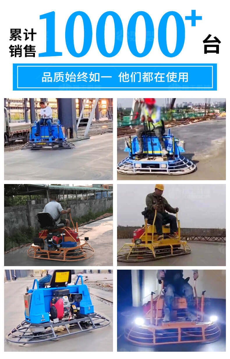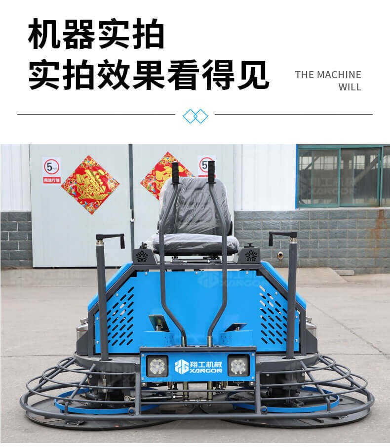座駕式混凝土抹光機(jī)用于混凝土地面的提漿、壓實、抹平、抹光,相對于手扶式抹光機(jī),效率高。