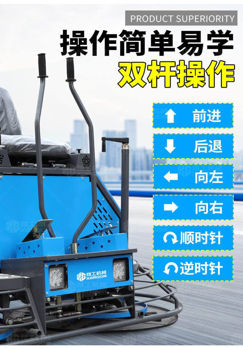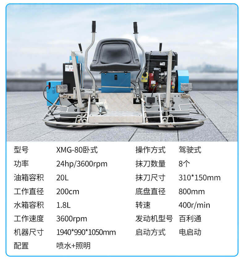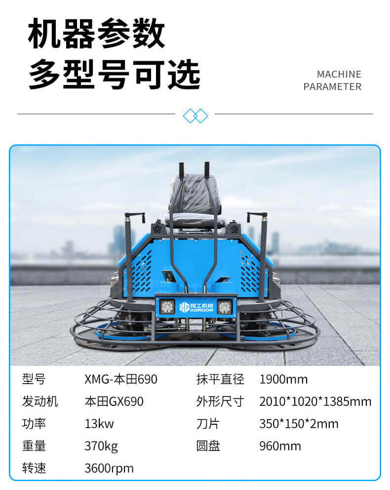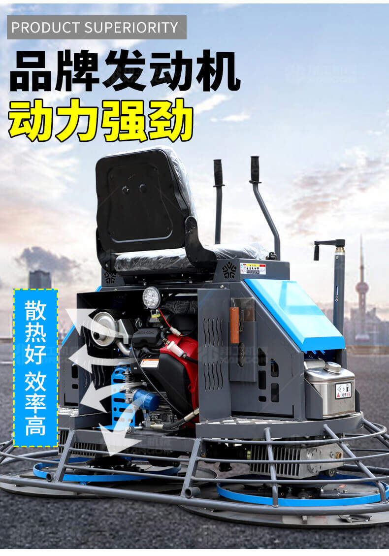 座駕式混凝土抹光機(jī)用于混凝土地面的提漿、壓實、抹平、抹光,相對于手扶式抹光機(jī),效率高。