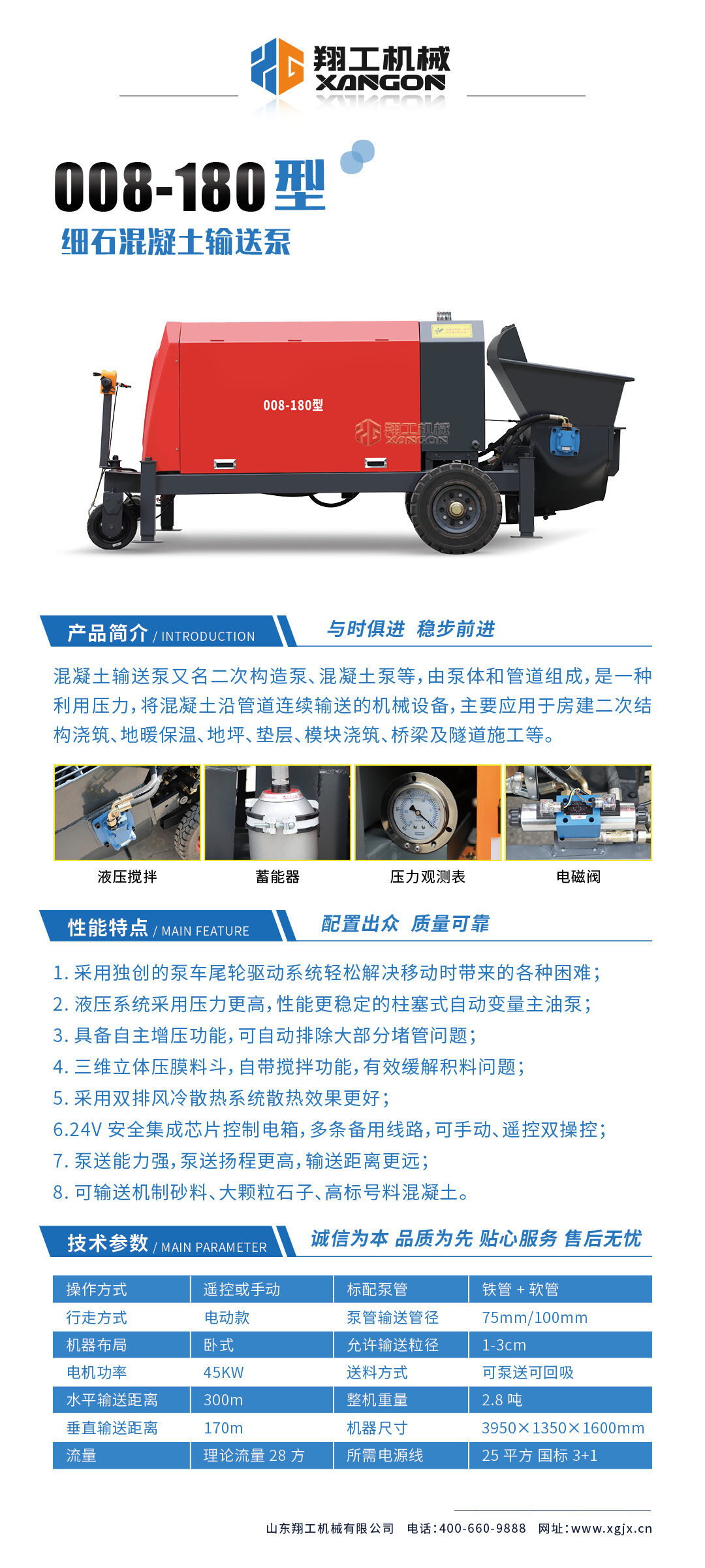 采用獨(dú)創(chuàng)的泵車(chē)尾輪驅(qū)動(dòng)系統(tǒng)輕松解決移動(dòng)時(shí)帶來(lái)的各種困難;采用雙排風(fēng)冷散熱系統(tǒng)散熱效果更好,液壓系統(tǒng)采用壓力更高,性能更穩(wěn)定的柱塞式自動(dòng)變量主油泵,采用先進(jìn)的三維立體壓模一體式自動(dòng)攪拌料斗可輸送機(jī)制砂,高標(biāo)號(hào)混凝土,有效緩解積料問(wèn)題。