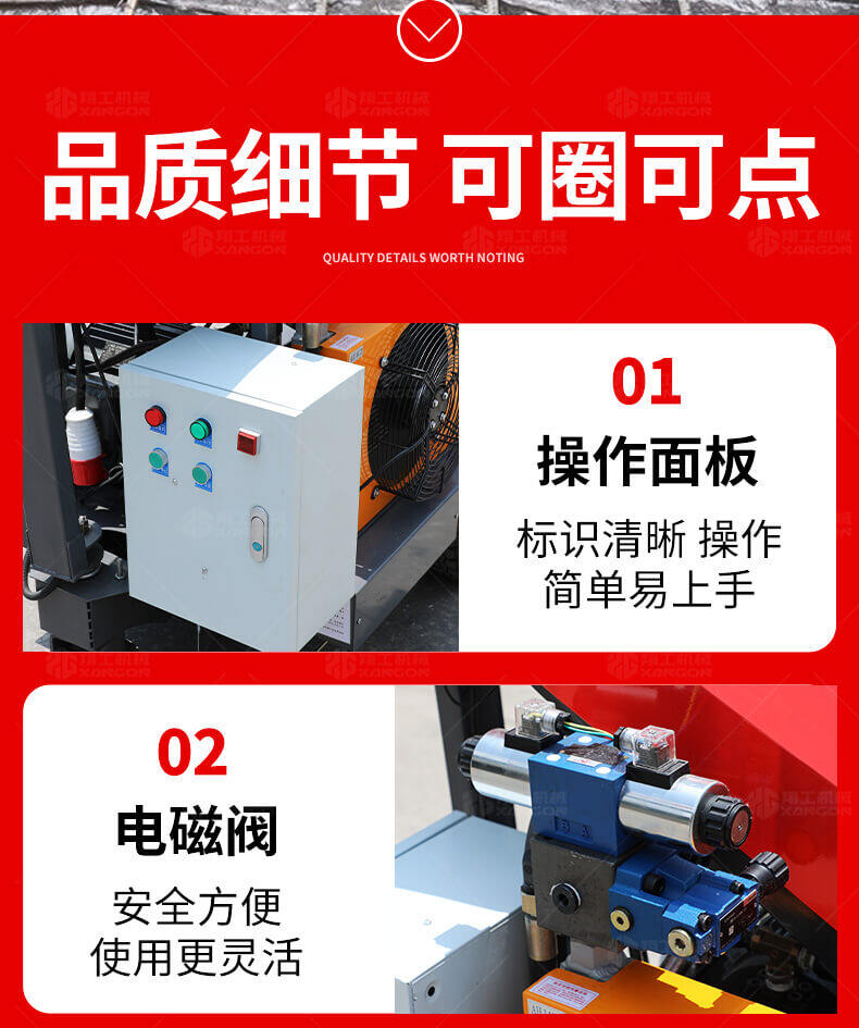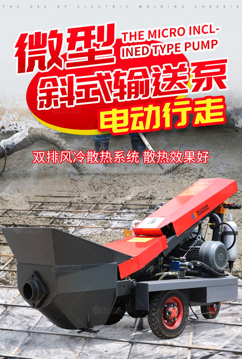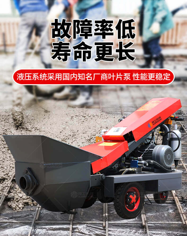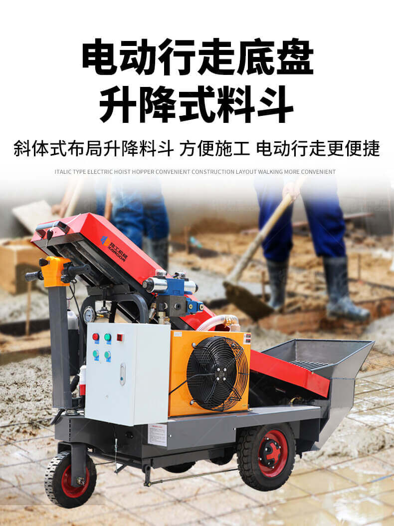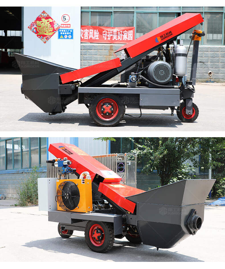 采用電動(dòng)行走底盤,斜體式布局升降料斗,采用雙排風(fēng)冷散熱系統(tǒng)散熱效果更好,液壓系統(tǒng)采用國內(nèi)知名廠商葉片泵,故障率低,壽命更長,性能更穩(wěn)定,超長行程料缸大大提高了輸送效率。