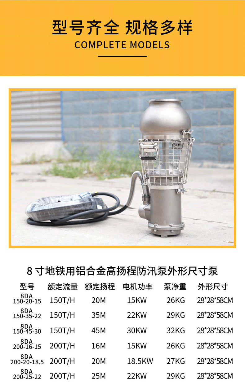 8寸地鐵防汛泵,鋁合金材質(zhì),高揚(yáng)程設(shè)計(jì),排水高效,耐腐蝕性強(qiáng),輕便易移動(dòng),專用于地鐵防汛搶險(xiǎn),保障地下空間安全。